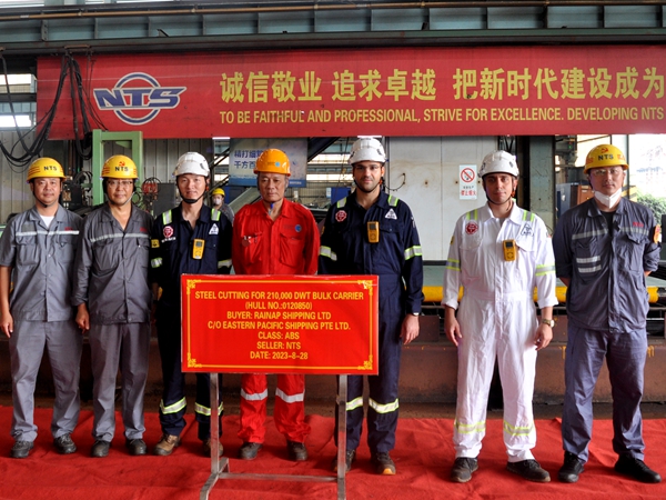 早在上午8:58,公司在新區(qū)鋼加車間3跨內(nèi)分別舉行船舶點(diǎn)火開工儀式,生產(chǎn)管理部、項(xiàng)目組、質(zhì)量部、營銷部等相關(guān)部門負(fù)責(zé)人與船東Eastern Pacific Shipping Pte. Ltd.(EPS)公司代表共同出席活動(dòng),見證50#210000噸雙燃料動(dòng)力散貨船與6#7000箱集裝箱船的船體結(jié)構(gòu)件開始預(yù)制。船東Eastern Pacific Shipping Pte. Ltd.(EPS),目前在我們企業(yè)訂有4艘110000噸油船和11艘210000噸雙燃料動(dòng)力散貨船、7艘7000箱集裝箱船、6艘50000噸化學(xué)品船和2艘155500噸雙燃料油船,此次開工的50#210000噸雙燃料動(dòng)力散貨船、6#7000箱集裝箱船分別是210000噸雙燃料動(dòng)力散貨船系列中的第11艘船舶、7000箱集裝箱船系列中的第6艘船舶。