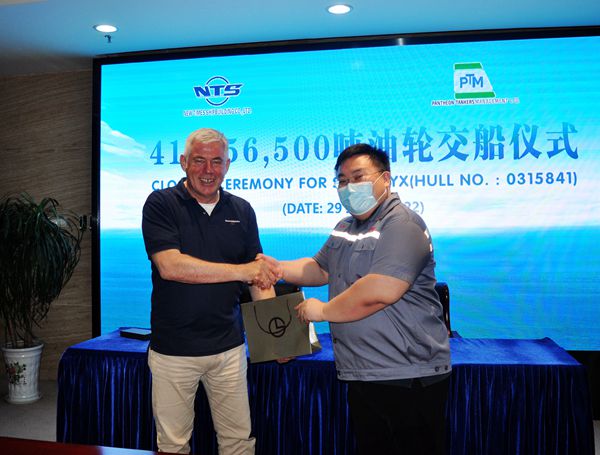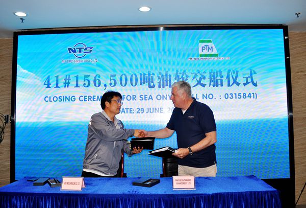 6月29日上午,公司在八樓會議室舉行船舶簽字交付儀式,41#156500噸油船成功交付希臘船東Pantheon Tankers公司運營。