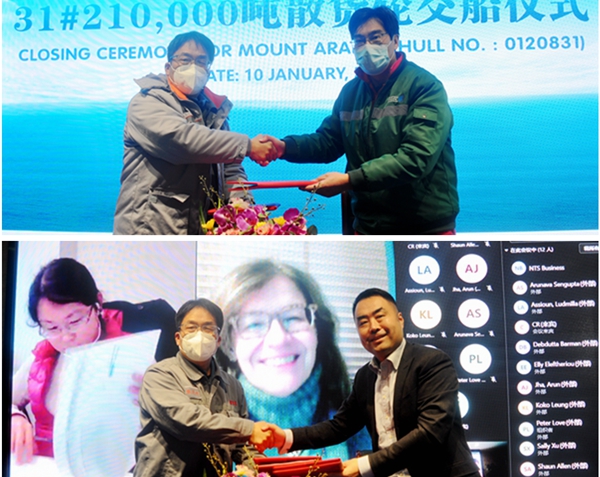 兩船交付:1月10日,31#210000噸雙燃料動力散貨船、1#120000噸散貨船相繼交付船東運營。上午10:00,31#210000噸雙燃料動力散貨船簽字儀式在辦公樓八樓會議室舉行;下午2:30,1#120000噸散貨船簽字交付船東。