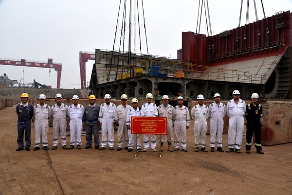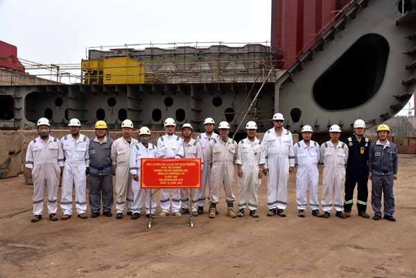 在鞭炮齊鳴中,39#40#210000噸雙燃料動(dòng)力散貨船船體結(jié)構(gòu)開(kāi)始合攏搭載。該型210000噸雙燃料動(dòng)力散貨船總長(zhǎng)299.95米,兩柱間長(zhǎng)294.75米、型寬50.00米,型深25.20米,設(shè)計(jì)吃水18.40米,結(jié)構(gòu)吃水18.48米,載重噸210000MT。