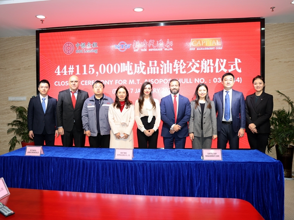 1月7日上午,44#115000噸油船簽字交付在辦公樓八樓會議室舉行,總經(jīng)理劉海金、常務(wù)副總經(jīng)理張玉永、副總經(jīng)理袁衡與希臘船東Capital代表Nicholas Los, Nikolas Vaporis、教母中銀金融租賃有限公司趙莉等嘉賓出席儀式。張玉永、Nikolas Vaporis、中銀金租代表施以航分別簽署交船文件,該船交付船東運營。