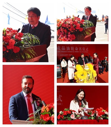 簽字儀式結(jié)束后,船舶命名儀式在東區(qū)舾裝碼頭上隆重舉行,張玉永致歡迎詞:Capital是希臘最大的海運公司之一,也是我們的重要客戶,雙方合作始于2022年8月的兩艘LR2型船項目,2023年又給我們帶來了6艘雙燃料蘇伊士型油輪和2艘雙燃料LR2型船,2024年繼續(xù)簽訂了10艘8400TEU雙燃料動力集裝箱船,衷心感謝Capital的信任,相信未來我們的合作會更加緊密。今天LR2項目首制船命名交付,我要感謝現(xiàn)場經(jīng)理Vitaliy監(jiān)造團(tuán)隊,你們的嚴(yán)謹(jǐn)工作作風(fēng)和務(wù)實工作態(tài)度,讓船舶建造高效快速推進(jìn)且質(zhì)量優(yōu)良;也要感謝勞氏船級社及其現(xiàn)場團(tuán)隊,一直努力為我們提供專業(yè)指導(dǎo),助力我們交付了眾多船舶;同時要感謝中銀金租趙莉優(yōu)秀團(tuán)隊,在船舶融資與交付方面給予的大力支持與協(xié)助,促成了船舶項目的順利推進(jìn)。