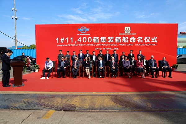 4月16日上午,公司舉行船舶命名儀式,1#11400箱、3#9#8100箱LNG雙燃料動力集裝箱船被分別命名為“MSC FLORA”“MSC CAMEROON”“MSC NAMIBIA”號。