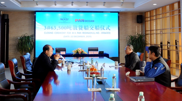 2020年即將過去,又一艘船舶完工交付,這是企業(yè)年度交付的第27艘船舶,年度累計(jì)交付船舶442.07萬載重噸。12月22日上午,公司在八樓會議室為3#63500噸散貨船舉行交船簽字儀式,公司總經(jīng)理劉海金、常務(wù)副總經(jīng)理張玉永與韓國船東Pan Ocean Co., Ltd.代表一起出席活動,簽署交船文本,共同見證該船正式交付運(yùn)營。