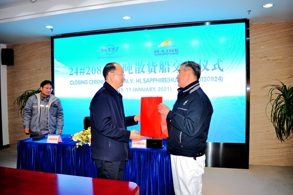 1月11日上午,公司在辦公樓八樓會議室舉行24#208000噸散貨船簽字交付儀式,總經(jīng)理劉海金、常務副總經(jīng)理張玉永與韓國船東H-LINE公司代表Young Hwan Lee先生一起出席,常務副總經(jīng)理張玉永與韓國船東H-LINE公司代表Young Hwan Lee先生共同簽署交船文本,24#208000噸散貨船正式交付船東運營。