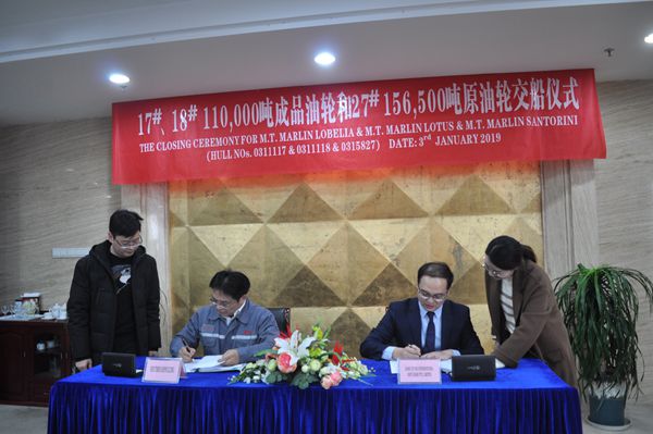 1月3日下午,公司在八樓會議室舉行船舶交付簽字儀式,總經理劉海金、常務副總經理張玉永與船東代表、船級社代表等嘉賓一起出席儀式。在大家的共同見證下,常務副總經理張玉永與船東代表分別在交船文本上簽字,三艘船舶正式交付,迎來了新年的交船“開門紅”。此次交付的船舶分別是17#18#110000噸成品油輪和27#156500噸原油輪。