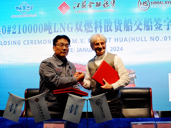 1月8日下午,40#210000噸雙燃料動力散貨船簽字交付儀式在公司八樓會議室舉行,常務副總經(jīng)理張玉永、副總經(jīng)理袁衡與船東喜馬拉雅公司現(xiàn)場經(jīng)理Davor Radic出席活動。張玉永與Davor Radic在現(xiàn)場交船文本上簽字、江蘇金租航運金融事業(yè)部總經(jīng)理張欣航線上簽署交船文件,40#210000噸雙燃料動力散貨船正式交付船東運營,這是新年來交付的第三艘船舶。