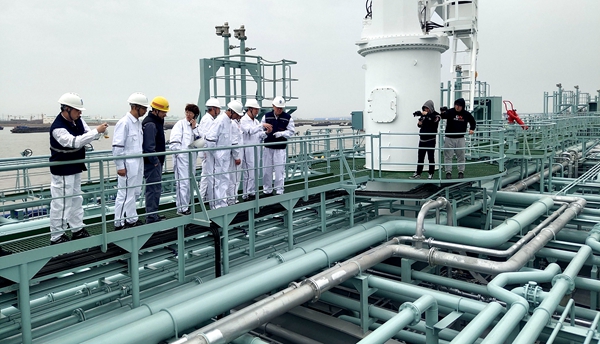 在劉海金總經(jīng)理的陪同下,山東海運公司董事長于冰、總經(jīng)理徐濤等一行嘉賓參觀了20#50000噸化學品船的甲板、機艙。站在新建的船舶上,看著嶄新的船舶設備設施和出航前船舶的運行狀態(tài),于冰董事長對給予了充分肯定和高度評價,并表示與新時代造船的精誠合作一定會讓雙方實現(xiàn)共贏目標。