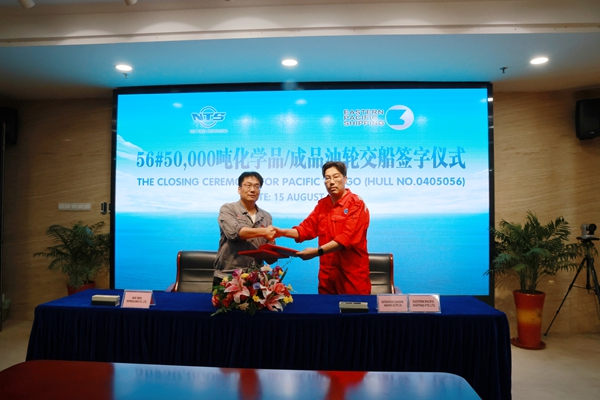 8月15日上午,56#50000噸Ⅱ類化學品船完工交付儀式在辦公樓八樓會議室舉行,常務副總經(jīng)理張玉永、副總經(jīng)理袁衡與新加坡船東EPS代表倪杰等參加儀式,見證船舶交付。