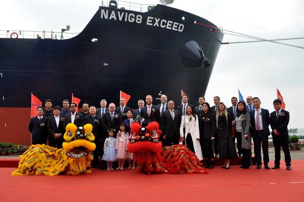 副總經(jīng)理袁衡主持命名儀式,并對遠(yuǎn)道而來的嘉賓表示了熱烈地歡迎。在喜慶的氣氛中,教母Hannah Jakubec將47#50000噸Ⅱ類化學(xué)品船命名為“NAVIG8 EXCEED”號,祝愿其在今后的航行中乘風(fēng)破浪,帶來源源不斷的財富。