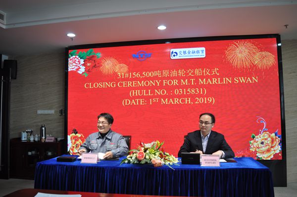 3月1日上午,公司新建的31#156500噸原油船簽字交付儀式在八樓會議室舉行,常務副總張玉永代表公司與船東代表簽署交船文本,該船正式交付。